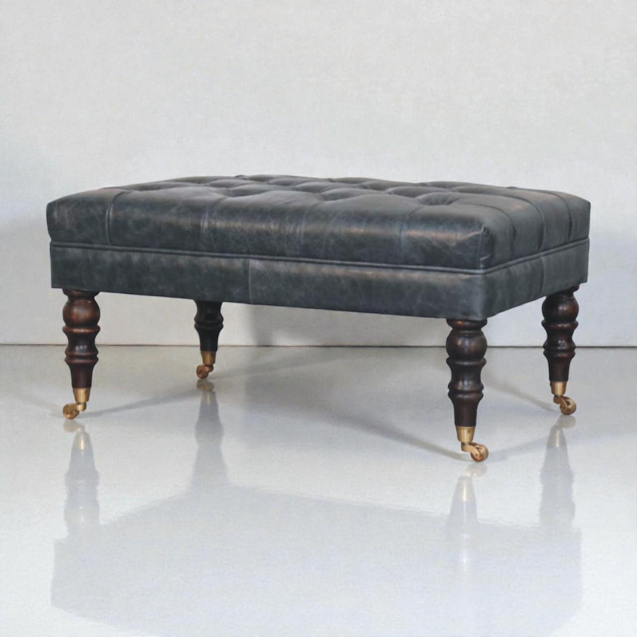 Handcrafted Buffalo Leather Ottoman with Brass Castor Legs Teal Tufted Bench