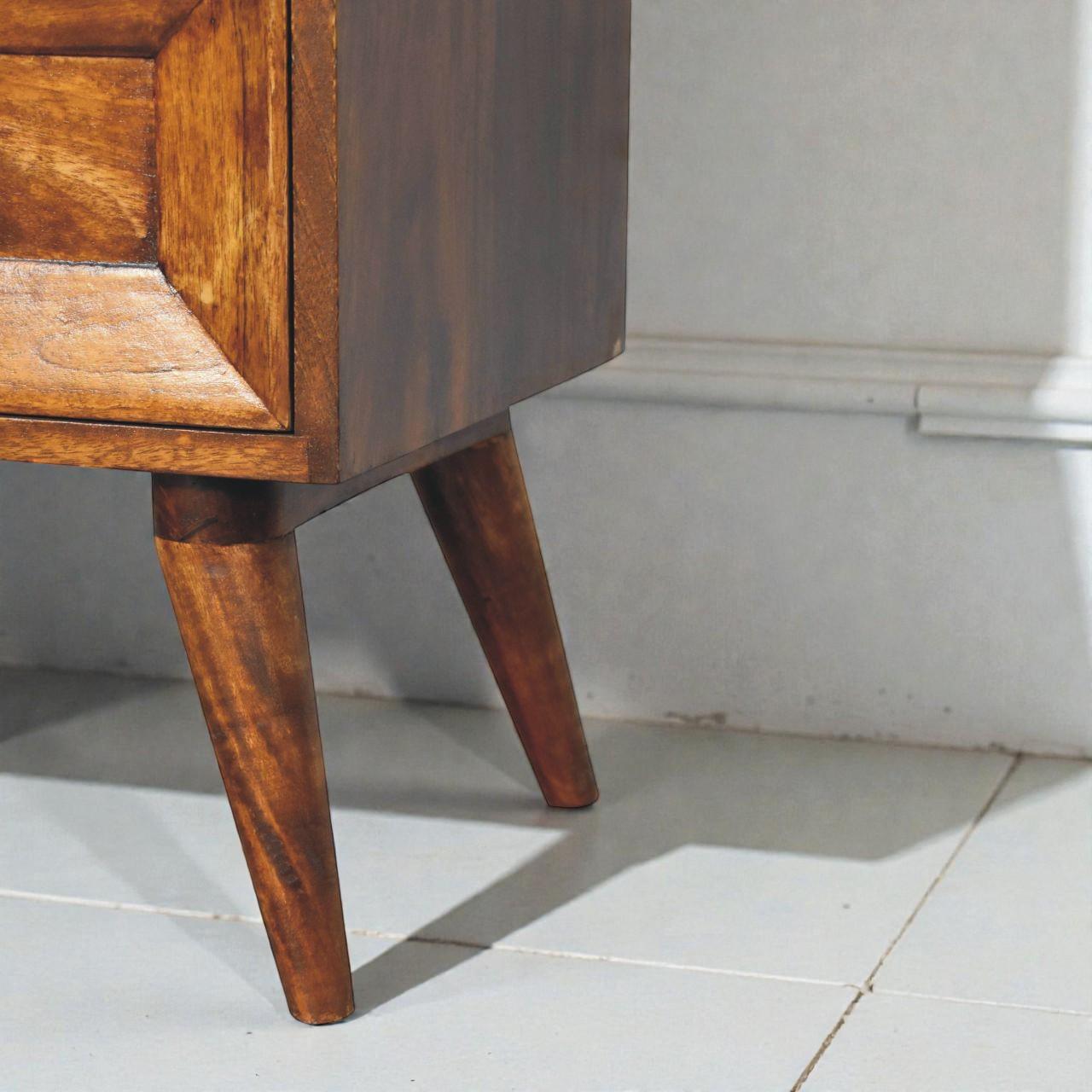 Add timeless craftsmanship and modern design to your bedroom with this beautifully handcrafted nightstand. Made from 100% solid Mango Wood in a warm chestnut finish, the piece features a striking geometric quad pattern on both drawer fronts — offering artful texture that stands out in any space.